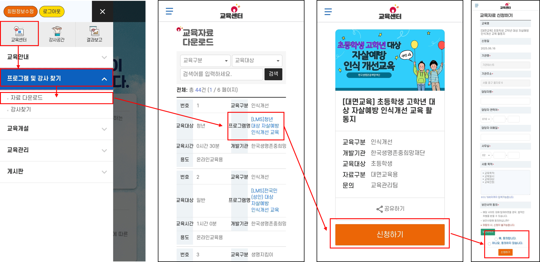 2) 진행할 교육 선택 후 [신청하기] 버튼 클릭하여 양식에 맞추어 신청서 작성